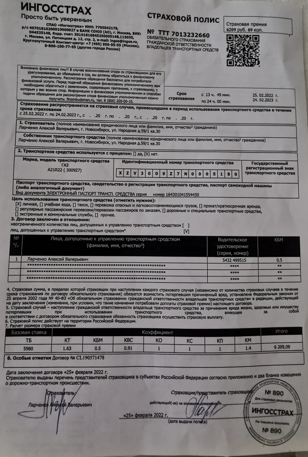 ОСАГО ТТТ7013232660 до 24.02.2023 проверено модераторами |